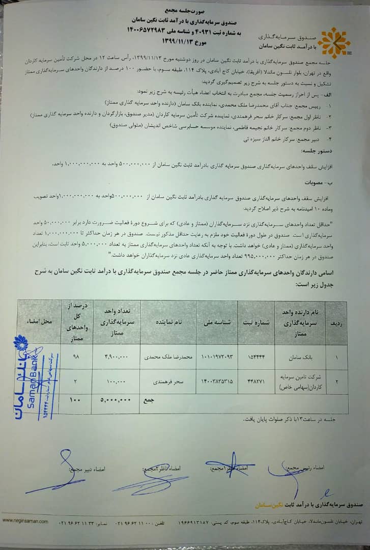 جلسه مجمع صندوق سرمایهگذاری با درآمد ثابت نگین سامان در روز دوشنبه مورخ 13/11/1399، رأس ساعت 12 در محل شرکت تأمین سرمایه کاردان واقع در تهران، بلوار نلسون ماندلا (آفریقا)، خیابان کاج آبادی، پلاک 114، طبقه سوم، با حضور 100 درصد از دارندگان واحدهای سرمایهگذاری ممتاز تشکیل و نسبت به دستور جلسه به شرح زیر تصمیمگیری گردید: الف- پس از احراز رسمیت جلسه، مجمع مبادرت به انتخاب اعضاء هیأت رئیسه به شرح زیر نمود: 1- رییس مجمع: سرکار خانم شبنم آذربایجانی، نماینده بانک سامان (دارنده واحد سرمایه گذاری ممتاز) 2- ناظر اول مجمع: سرکار خانم سحر فرهمندی، نماینده شرکت تأمین سرمایه کاردان (مدیر صندوق و دارنده واحد سرمایه گذاری ممتاز) 3- ناظر دوم مجمع: سرکار خانم نجیمه فاطمی، نماینده موسسه حسابرسی شاخص اندیشان (متولی صندوق) 4- دبیر مجمع: سرکار خانم الناز سبزه ئی دستور جلسه: افزایش سقف واحدهای سرمایهگذاری صندوق سرمایه گذاری بادرآمد ثابت نگین سامان از 500.000.000 واحد به 1.000.000.000 واحد، ب- مصوبات افزایش سقف واحدهای سرمایهگذاری صندوق سرمایه گذاری بادرآمد ثابت نگین سامان از 500.000.000واحد به 1.000.000.000واحد تصویب وماده 10 امیدنامه به شرح ذیر اصلاح گردید: "حداقل تعداد واحدهای سرمایهگذاری نزد سرمایهگذاران (ممتاز و عادی) که برای شروع دورة فعالیت ضرورت دارد برابر 50.000.000 واحد سرمایهگذاری است. صندوق در طول دورة فعالیت خود ملزم به رعایت حداقل مذکور نیست. صندوق در هر زمان حداکثر تا 1.000.000.000 تعداد واحد سرمایهگذاری (ممتاز و عادی) خواهد داشت. با توجه به آنکه تعداد واحدهای سرمایهگذاری ممتاز به تعداد 5.000.000 واحد ثابت است، بنابراین صندوق در هر زمان حداکثر 995.000.000 تعداد واحد سرمایهگذاری عادی نزد سرمایهگذاران خواهد داشت."