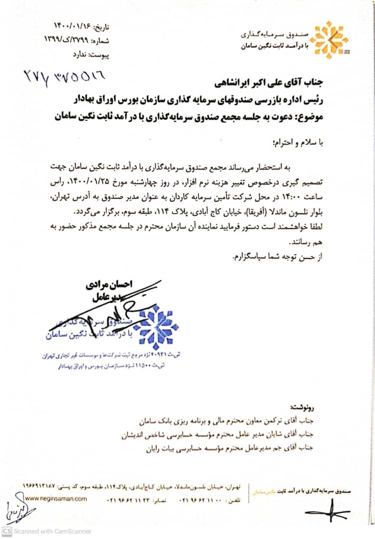با سلام و احترام؛ به استحضار میرساند مجمع صندوق سرمایهگذاری بادرآمد ثابت نگین سامان جهت تصمیم گیری درخصوص تغییر هزینه نرم افزار، در روز چهارشنبه مورخ 1400/01/25 ، راس ساعت 14:00 در محل شرکت تأمین سرمایه کاردان به عنوان مدیر صندوق به آدرس تهران، بلوار نلسون ماندلا (آفریقا)، خیابان کاج آبادی، پلاک 114، طبقه سوم، برگزار میگردد.