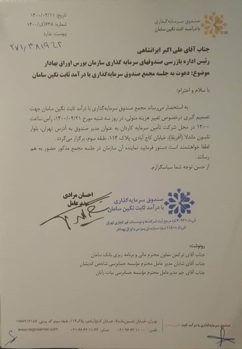 با سلام و احترام؛ به استحضار میرساند مجمع صندوق سرمایهگذاری بادرآمد ثابت نگین سامان جهت تصمیم گیری درخصوص تغییر هزینه متولی، در روز سه شنبه مورخ 1400/02/21، راس ساعت 12:00 در محل شرکت تأمین سرمایه کاردان به عنوان مدیر صندوق به آدرس تهران، بلوار نلسون ماندلا (آفریقا)، خیابان کاج آبادی، پلاک 114، طبقه سوم، برگزار میگردد. |