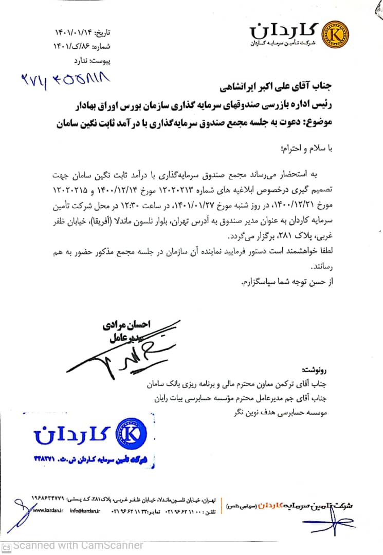دعوت به مجمع صندوق نگین سامان سامان مورخ 1401/01/27 ساعت 12 در خصوص ابلاغیه 12020217